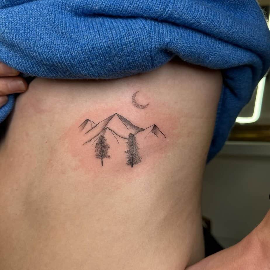 Ribcage tattoos are perfect when you want the option to hide or reveal your ink. An abstract mountain there feels intimate — personal art you can wear when you want and keep private when you don’t.