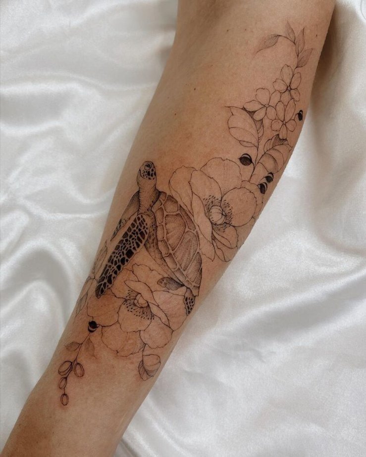 Combining a turtle with flowers mixes ocean steadiness with terrestrial beauty. It’s a lovely way to show you love both the sea and the land, or to add softer meaning to a creature-themed tattoo.