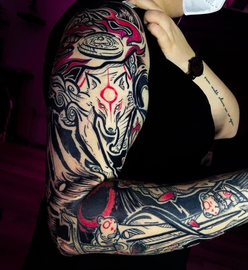 If you want to go big, a sleeve does the story justice. This one leans heavy on black and red, with Okami woven into intricate imagery. It’s bold and cinematic — a statement piece that tells a full chapter of a myth on your skin.