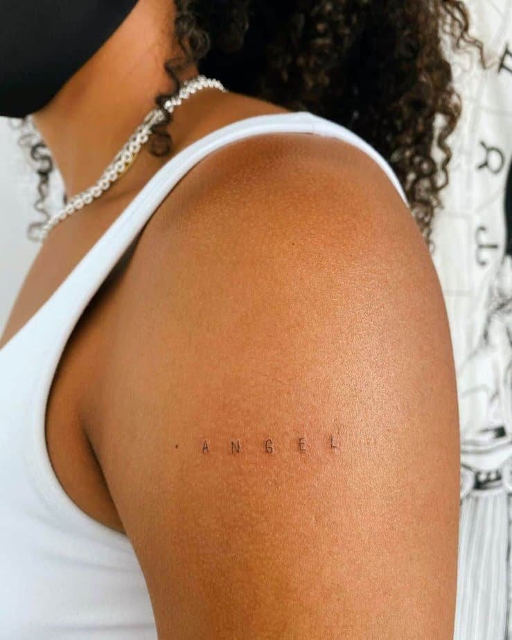 Whether you’re trying to be angelic or leaning into irony, “angel” on your shoulder reads sweet and a little mysterious. It’s a gentle way of saying you’re working on being your best self—or just that you like the sound of the word.