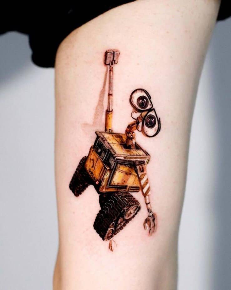 Okay, can we talk about how WALL‑E still hits different? This tattoo nails that curious, slightly rusty wonder in his eyes — like he’s about to roll right off your skin and go tidy up the world. The detail here is gorgeous; you can practically see the texture of his metal and the weight of years on his frame. It’s the kind of piece that reads as both adorable and quietly profound, a little reminder about caring for the world and for each other.