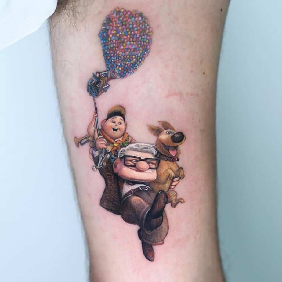 This forearm tattoo in a faded Polaroid vibe is the kind of thing that makes you sigh in the best way. Carl and Ellie’s smiles are warm and gentle, and the whole piece feels nostalgic without being twee. It’s a quiet, beautiful nod to a love that grows softer and truer over time — the sort of tattoo you look at and remember the good parts of life.