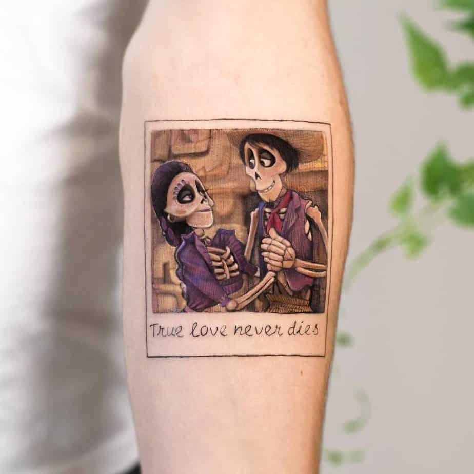 A sepia, Polaroid‑style tattoo of Hector and Imelda is the kind of ink that tugs gently at your heart. It celebrates a love that outlasts everything, with tender expressions that feel timeless. It’s romantic in a very deep, bittersweet way.