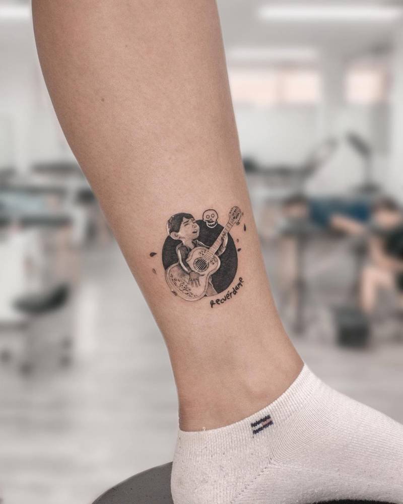 This black‑and‑white Miguel tattoo is simple but full of feeling. Guitar in hand, he’s the picture of passion — the sort of art that quietly says: follow what moves you. It’s clean, evocative, and instantly relatable if music is your lifeline.