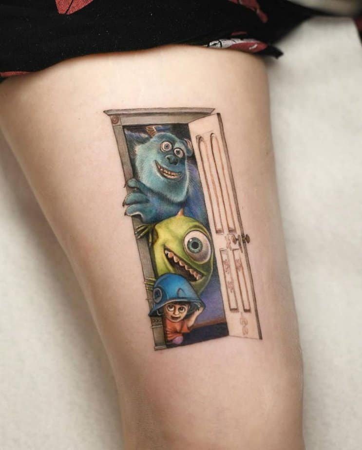 I love how playful this thigh piece is — Sulley, Mike, and Boo practically bursting through a door like they’re about to cause the best kind of trouble. The colors are loud, the expressions are everything, and it reads like a little scene from a comic strip. If you want a tattoo that’s fun and full of personality, this is it: it’s mischievous, warm, and absolutely charming.