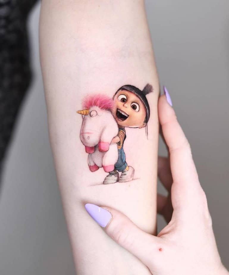 Agnes hugging that giant fluffy unicorn is a whole mood. This tattoo captures that exact moment of ridiculous, squealy joy — you can feel how much she adores it. It’s sweet, a little silly, and perfect for anyone who still gets irrationally excited about small, soft things.
