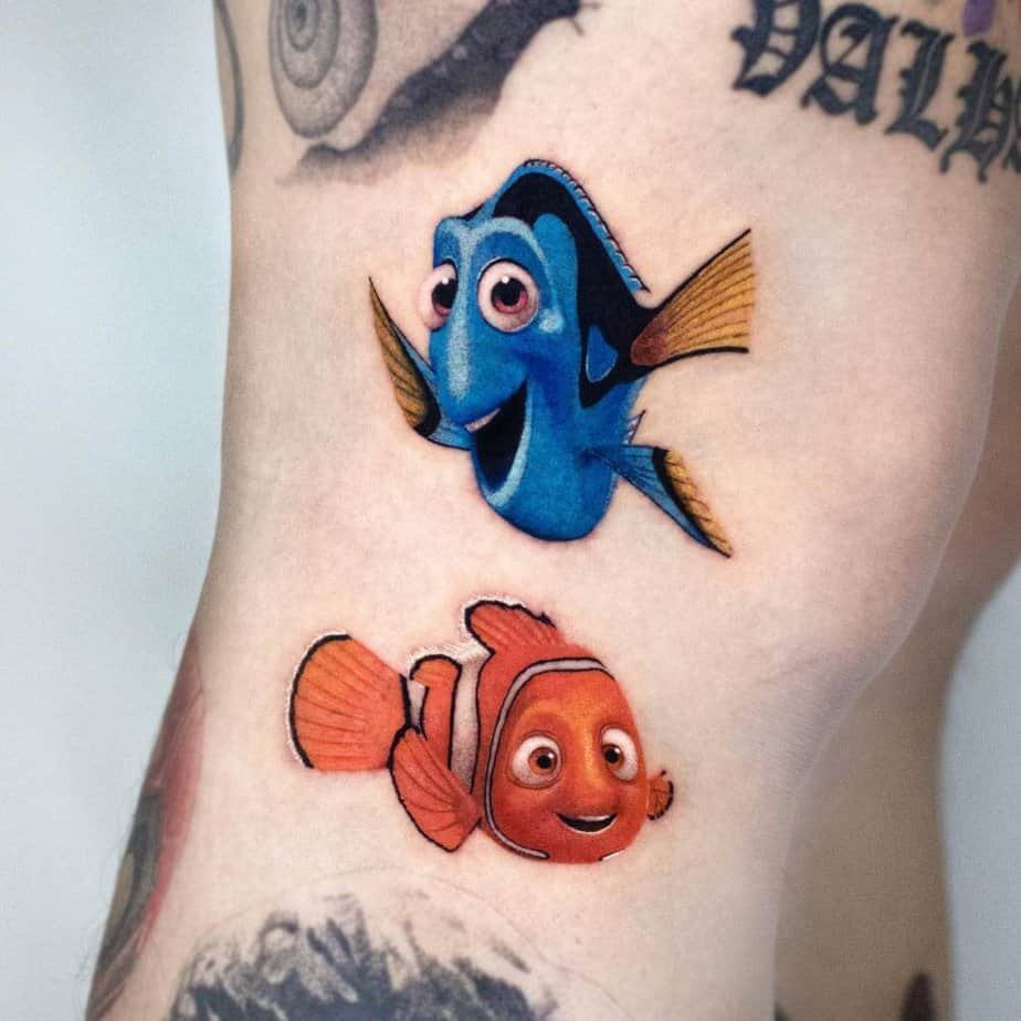 This vibrant Dory and Nemo piece is all about perseverance and playful adventure. The colors pop and the expressions are so on point — equal parts goofy and determined. It’s one of those tattoos that cheers you up on a tough day and reminds you to keep going, even when things feel murky.