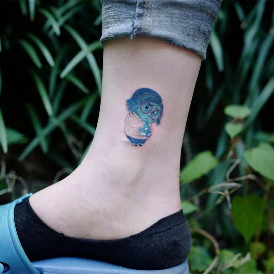 There’s something honest about a small Sadness tattoo on your ankle. It’s gentle, understated, and a reminder that feeling blue doesn’t make you weak — it makes you human. The slouched posture and expressive eyes are simple but so effective.