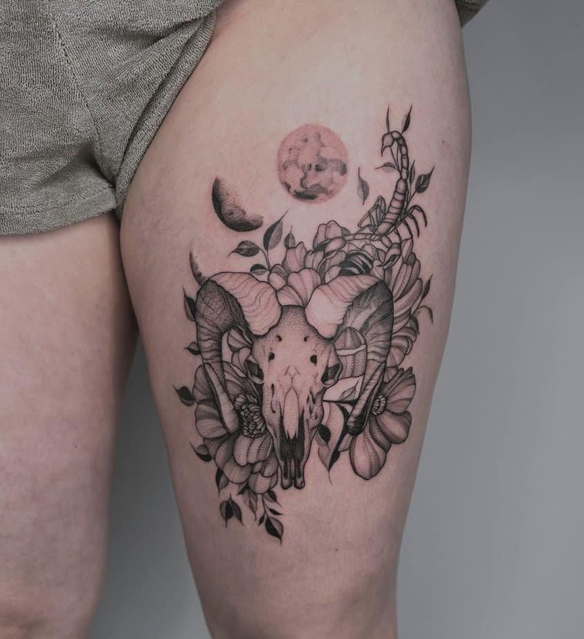 A moon tucked above the skull with blooms all around gives this thigh piece a gentle, spiritual rhythm. If you feel connected to nature and the night sky, this design wraps both of those loves into one tidy, beautiful package.