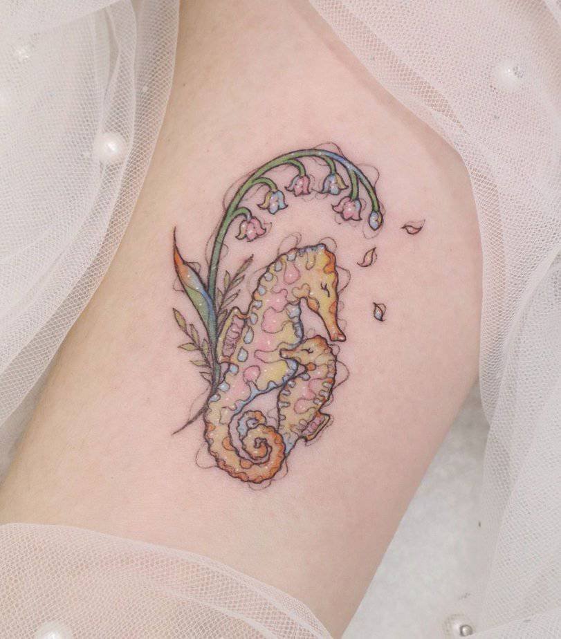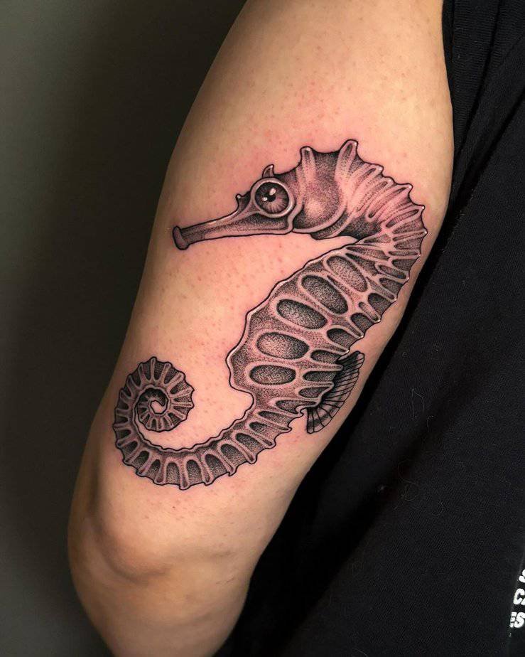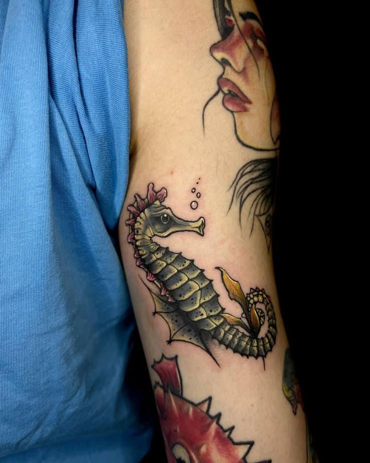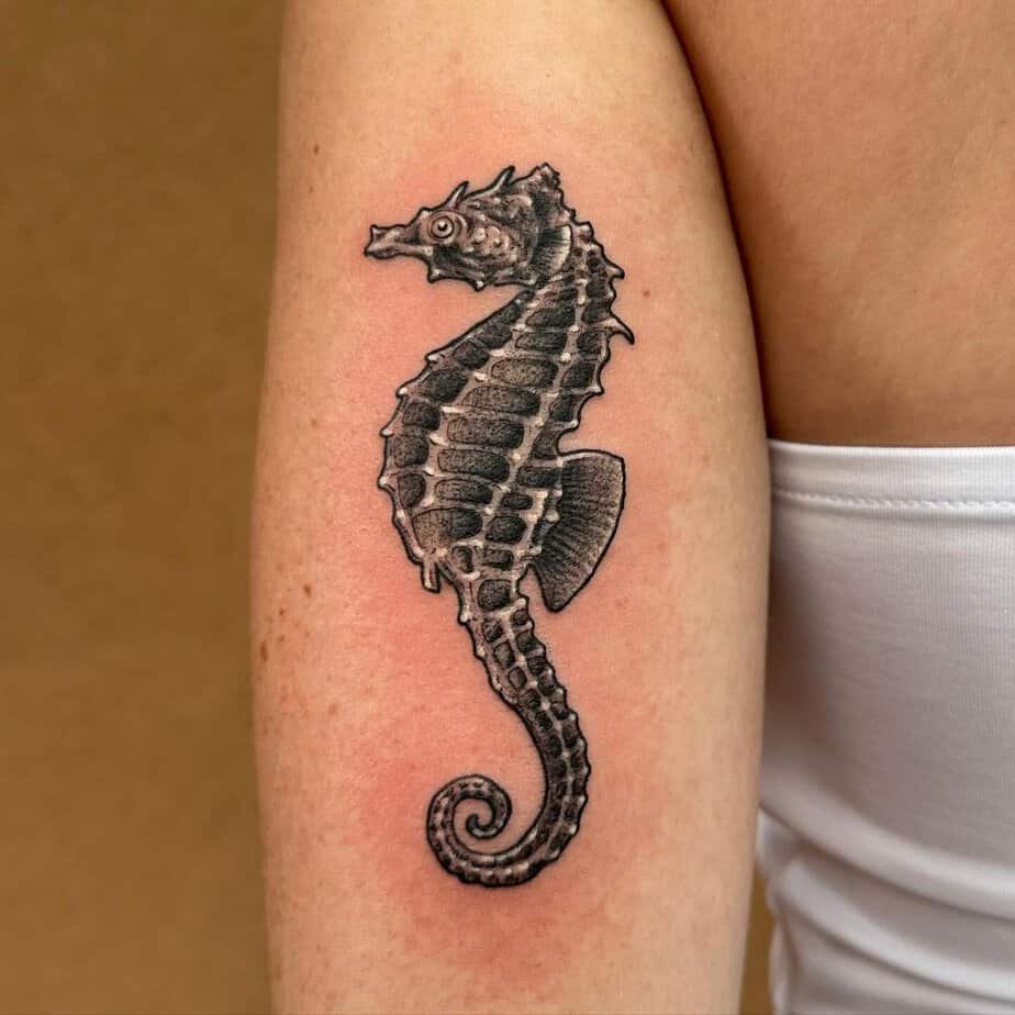 Small tattoos have a special kind of intimacy, and this tiny seahorse proves it. Placed on the upper arm, it’s discreet but meaningful — a little nod to the sea that’s private and chic. The simplicity is genuinely the charm here.