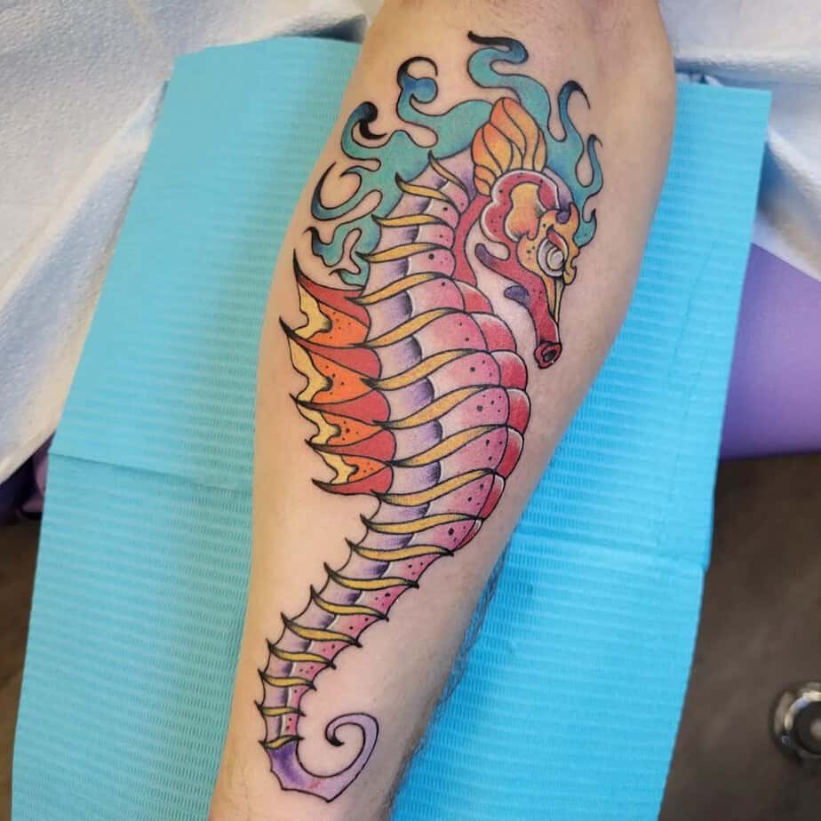 This style mixes bold outlines with nuanced shading and muted-but-rich colors, giving the seahorse depth and personality. It’s a great choice if you like something that nods to tradition but feels contemporary and artful.