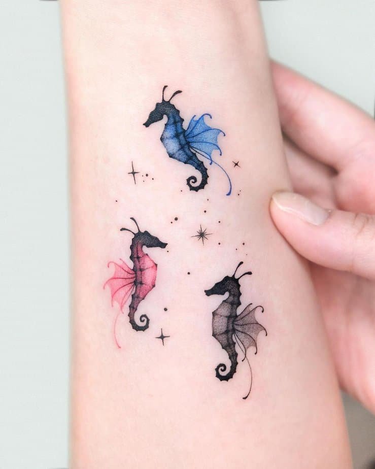Three seahorses, three color stories — this design is playful and expressive. Each tiny creature gets its own palette and personality, which makes the whole piece feel joyful and individual. On the inner forearm it practically becomes wearable art.