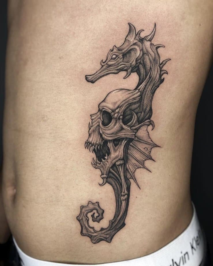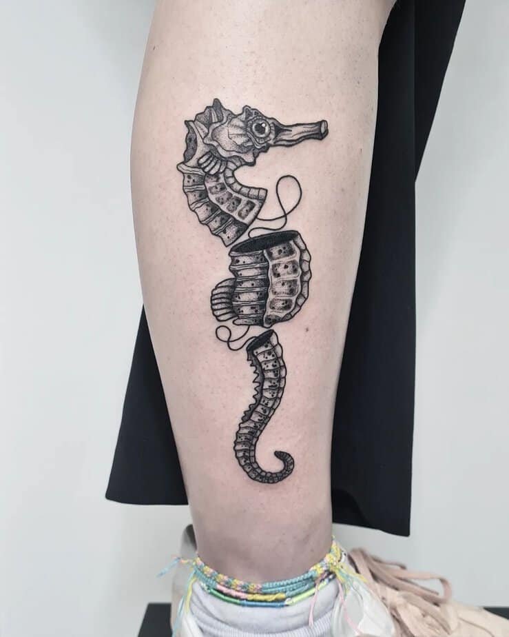 Sometimes you just want a smiling little buddy on your skin. This cartoonish seahorse with its bubbly friends (bubbles and a smiling starfish, yes please) is lighthearted and joyful. Simple lines, soft shading — it’s ideal if you want a tattoo that makes you grin every time you glance at it.