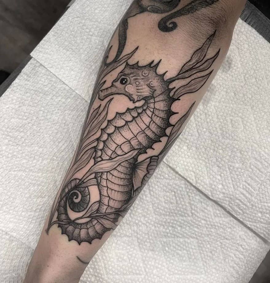 I love how this one wraps the seahorse in seaweed so it looks like it’s actually drifting along your skin. The flowing lines give it a real sense of movement, and the fine shading keeps it realistic without being heavy. On the forearm it’s so visible that you’ll catch little smiles from people who notice the marine harmony in the design.