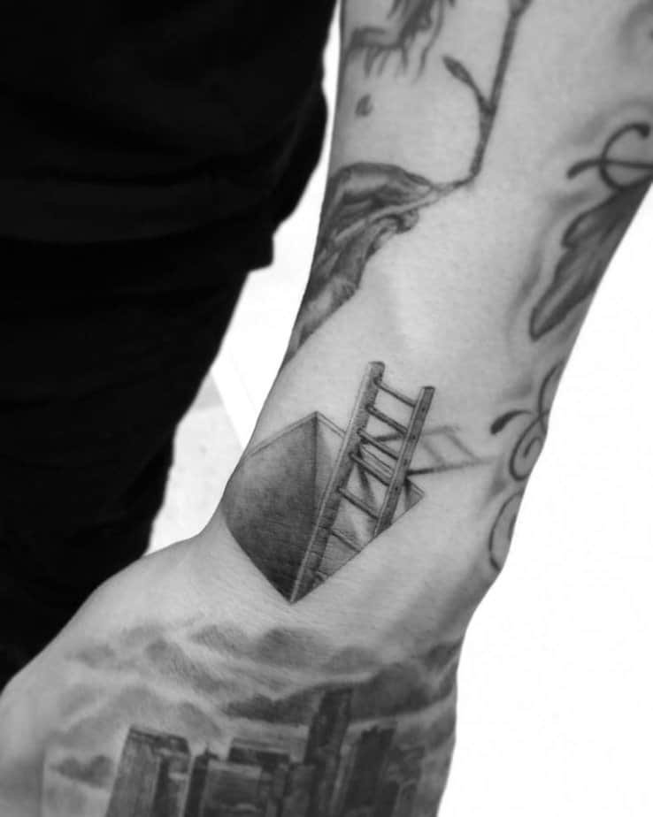 There’s a wrist tattoo here that looks like a ladder disappearing into a square void — clever and a little mysterious. It’s one of those pieces that reminds you there’s always a way out, even when things feel boxed in. Perfect for anyone who needs a tiny, daily nudge: keep climbing, keep believing in yourself.