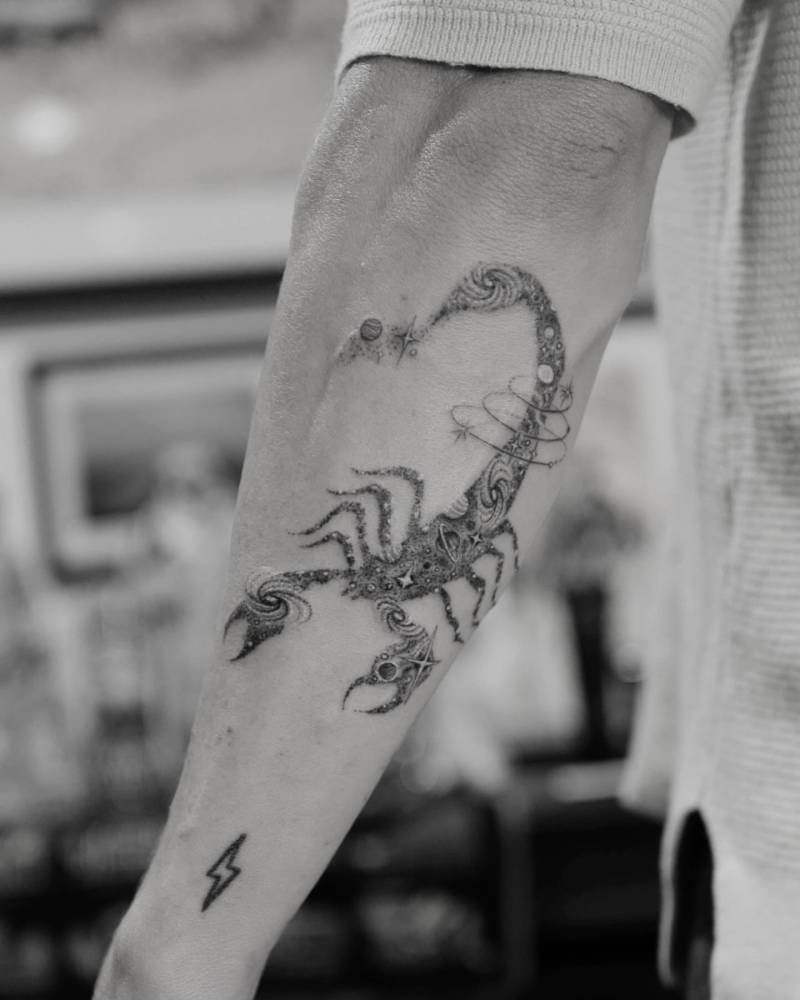 Imagine a scorpion whose body is actually stardust, comets, and tiny planets — this forearm piece blends astrology with cosmic beauty. It’s perfect if you’re a Scorpio or just love the idea of strength mixed with a bigger universe of growth and mystery. Ethereal and empowered all at once.