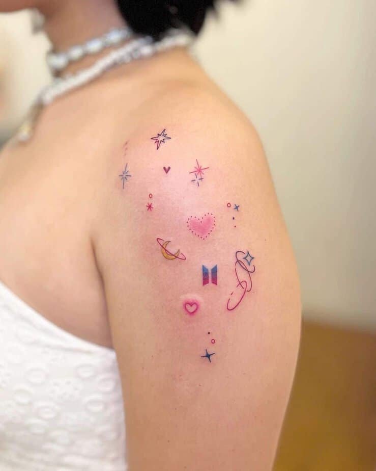 This palette of pinks, blues, and purples is basically a tiny celebration on your shoulder. It’s bright without being overwhelming and definitely a conversation starter.