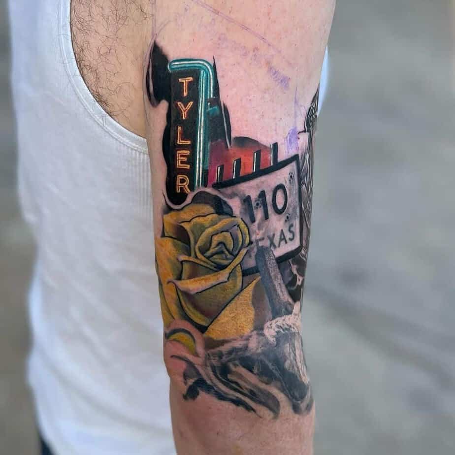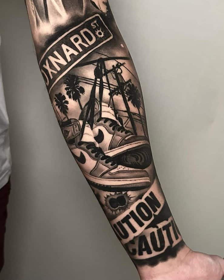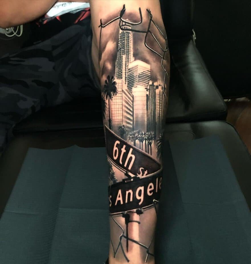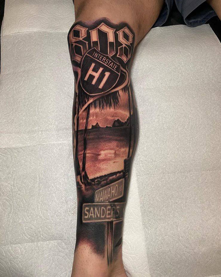 This one’s got street signs, a car, palm trees, and subtle lettering — all compacted into a neat forearm piece. It’s detailed but wearable, the kind you point to when someone asks where you’re from.