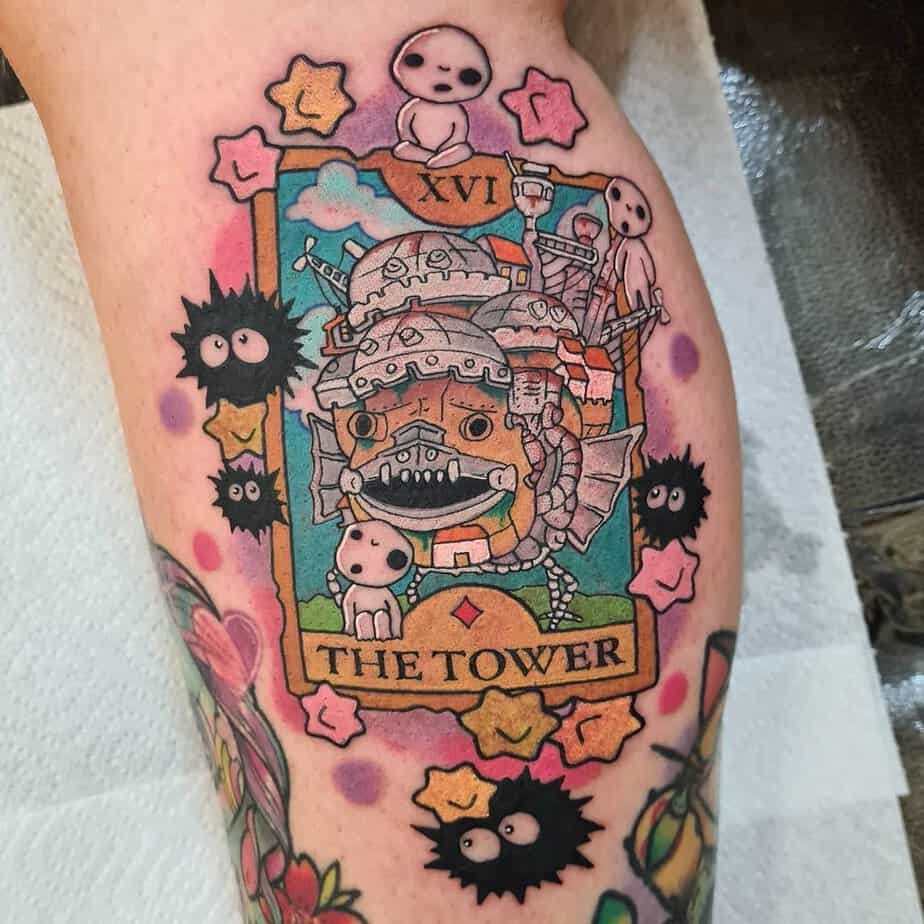 Howl’s castle framed like "The Tower" tarot card, with Soot Sprites, Kodama, and star candies sprinkled around — colorful, whimsical, and totally charming. It feels like a little storybook scene you can wear on your leg; bright and full of character.