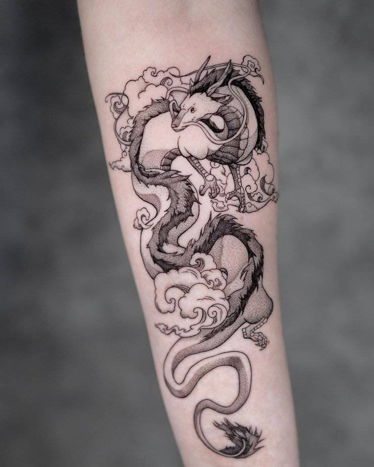 Haku in dragon form is just cinematic on skin. Coiled, surrounded by swirling clouds, done in detailed black-and-grey — it feels alive, like he could slide off your arm and take flight. Perfect if you want something dramatic, mystical, and beautifully detailed.