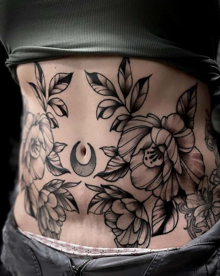 Want to go all out? A floral spread that stretches across the belly with a little moon around the belly button is romantic and a little mystical. It turns the area into a personal little landscape — poetic and eye-catching.