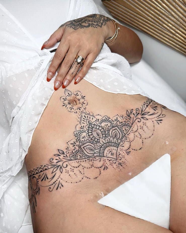 You don’t have to only tattoo the scar area. Some people choose to embellish the entire stomach with dots, ornaments, or florals so the scar becomes part of a larger composition. It distracts the eye and feels cohesive — like a garment you chose for yourself.