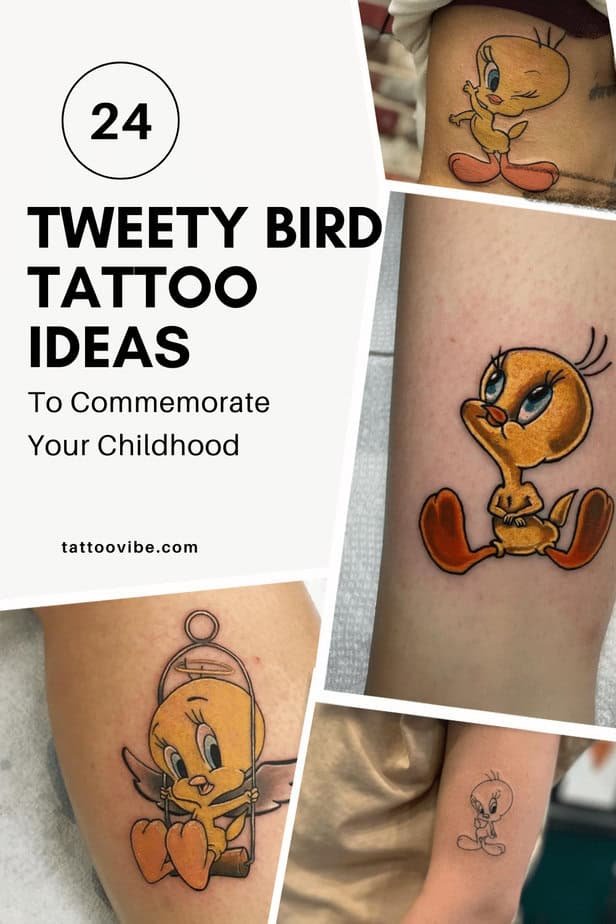You’ll also see creative twists: flowers around Tweety for a soft, feminine vibe; versions with dramatic darker shadows for contrast; lighter shadows made from darker color tones instead of black; tiny but perfectly detailed tattoos that still hold all the personality; playful, childlike designs that look like a kid colored outside the lines; and hybrids with black-and-gray wings so Tweety can pretend to be angelic (we all know he’s probably plotting). There are little tokens or items he holds, a tiny swing in his cage for authenticity, color-only outlines that blend into the piece, and even a cheeky ‘gangster’ Tweety on a guy that flips the script on how cute can be masculine.