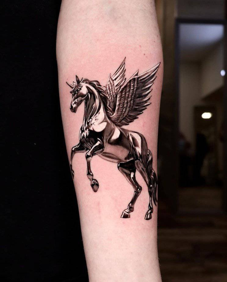 This feels similar to the triangle piece but with its own soft personality — delicate watercolor tones, flowing mane, and a dreamy aura. It’s the kind of tattoo that looks like it could’ve floated right off a canvas. For lovers of painterly designs, this one’s a romantic favorite.