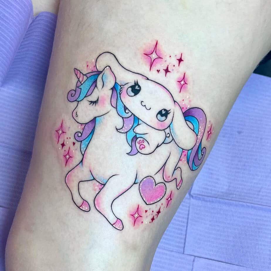 There’s something so tender about a young unicorn sleeping on fluffy clouds under the moon. It reads like a bedtime story come to life — calm, innocent, and quietly enchanting. If you want a tattoo that feels like comfort and wonder, this one’s a beautiful choice.