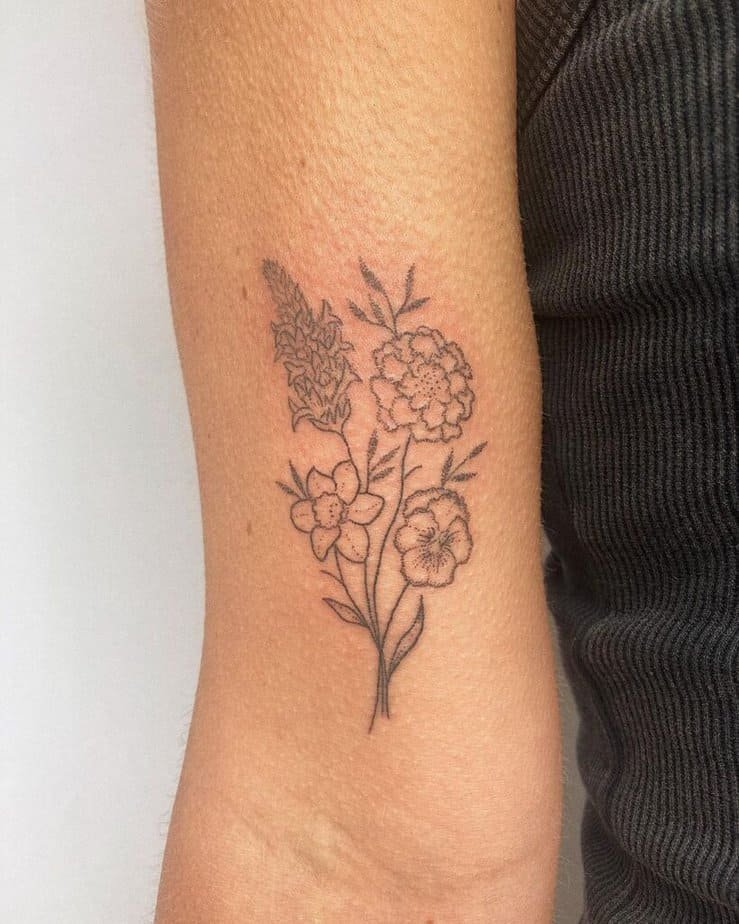 Realistic tattoos stop you mid-scroll. They look like actual flowers at first glance, and then you remember — oh right, this is ink. If you want a show-stopping violet, realism is gorgeous.