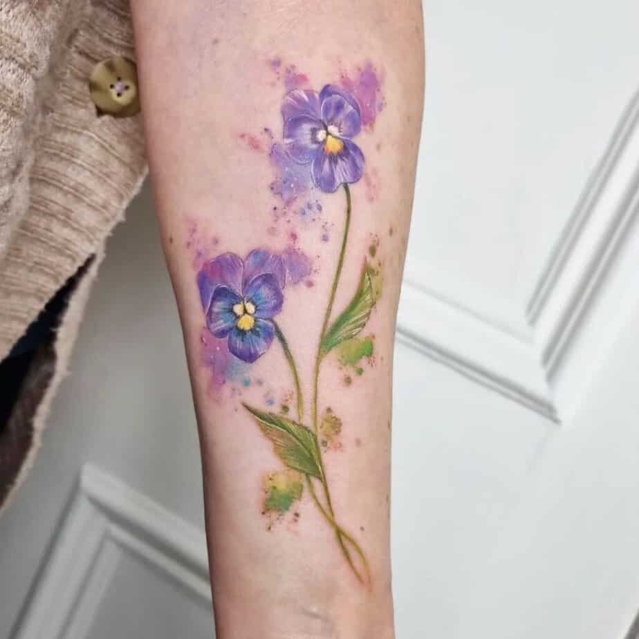 Watercolor style gives a violet this floaty, layered look. Artists can play with shades and texture so it reads like a tiny painting. Heads-up: choose someone who’s practiced in watercolor tattooing, because the subtleties matter.