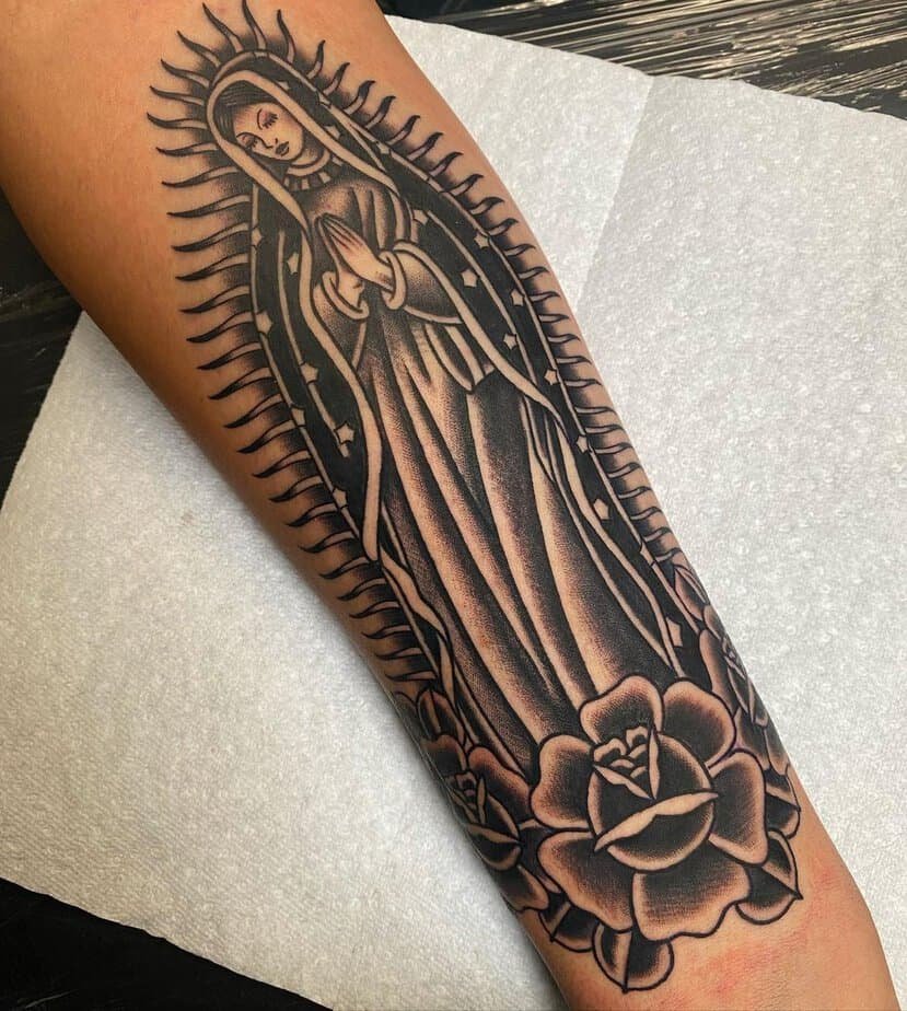 This version flips the script a bit — Virgin Mary with a determined look and a pistol. It’s bold, a little edgy, and definitely modern. The realism in the black-and-gray work and the rose details make it feel like a statement about strength and protection, not just tradition.
