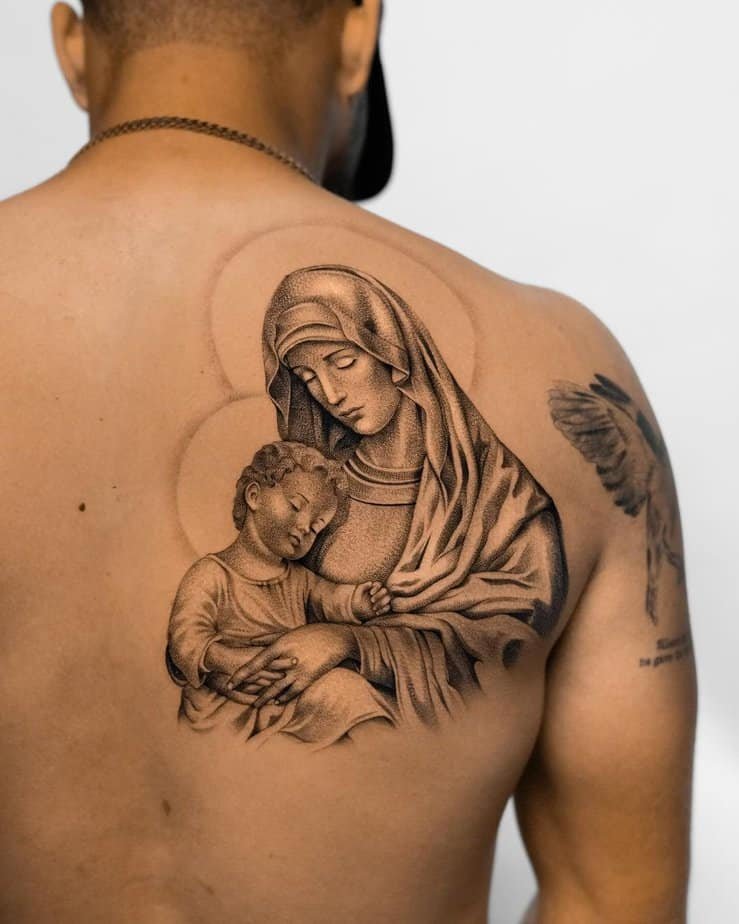 A tender depiction of the Virgin Mary holding baby Jesus — the soft shading and small details make this feel so warm and protective. If you want a tattoo that celebrates motherhood, care, or that sacred bond, this is a gorgeous, heartfelt option.