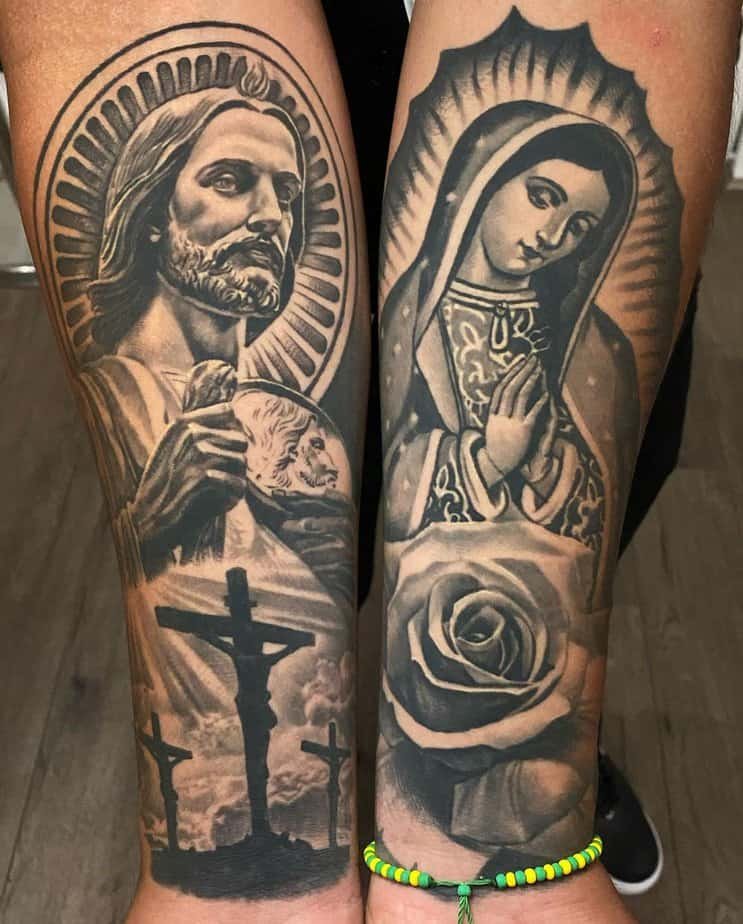 These matching forearm pieces of Jesus and the Virgin Mary really play off each other. The black-and-gray work makes the connection between them feel intimate and solemn, and the details in their faces give each piece its own life. It’s a beautiful option if you’re thinking of a coordinated tattoo or something that reads as part of a larger narrative on your skin.